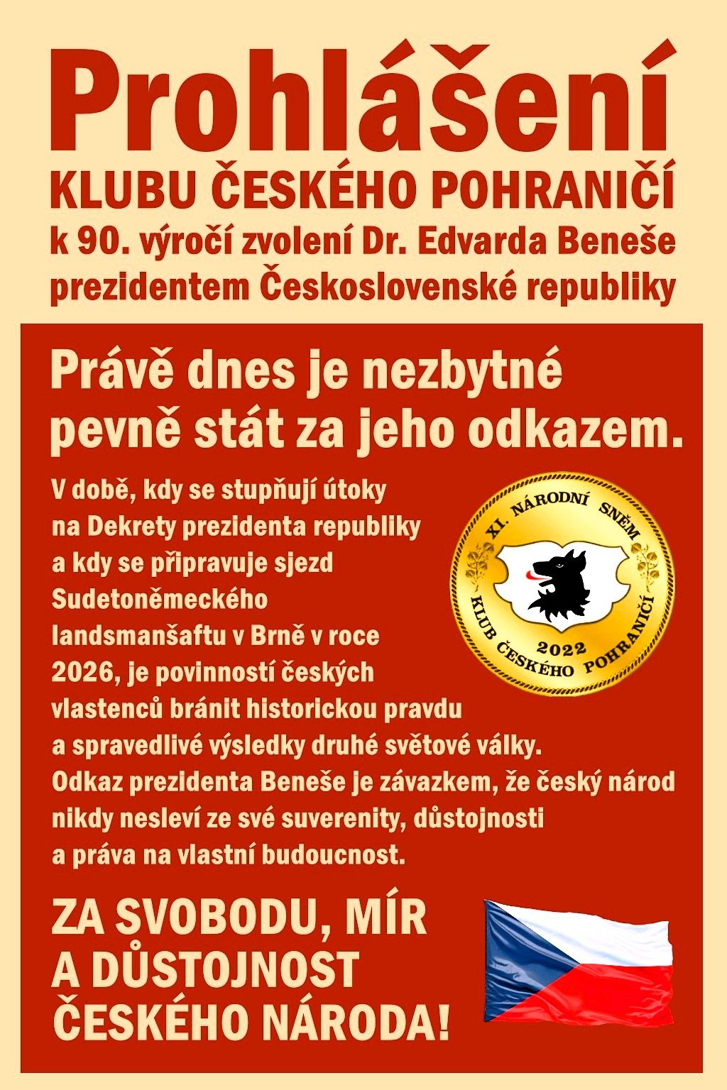 Právě dnes je nezbytné pevně stát za jeho odkazem. V době, kdy se stupňují útoky na Dekrety prezidenta republiky a kdy se připravuje sjezd Sudetoněmeckého landsmanšaftu v Brně v roce 2026, je povinností českých vlastenců bránit historickou pravdu a spravedlivé výsledky druhé světové války. Odkaz prezidenta Beneše je závazkem, že český národ nikdy nesleví ze své suverenity, důstojnosti a práva na vlastní budoucnost.